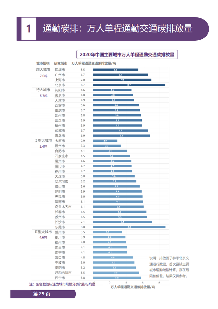 此外,中国主要城市万人单程通勤交通碳排放量总体平均值为5.7吨/日,换算每人、每年(往返)通勤交通碳排放量为0.29吨。短距离通勤和绿色出行有助于降低碳排放,超大城市中深圳的万人单程通勤交通碳排放量为5.5吨/日,远低于多数特大城市甚至大城市中长沙、苏州和西宁,这受益于深圳良好的职住平衡、相对较短的通勤距离和超过75%的绿色出行比例。