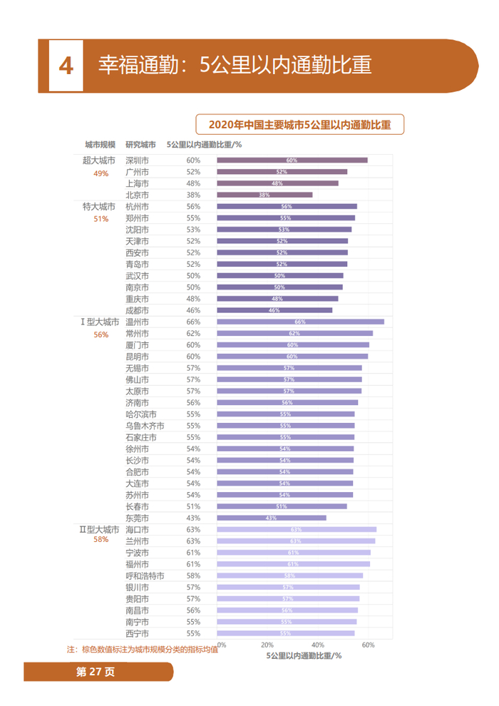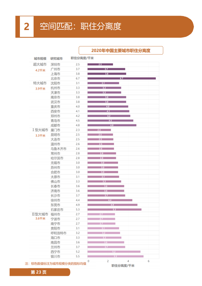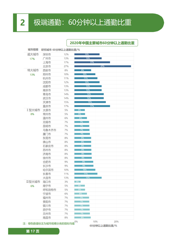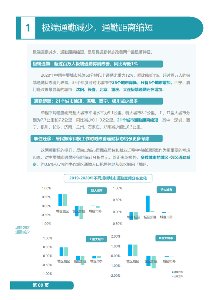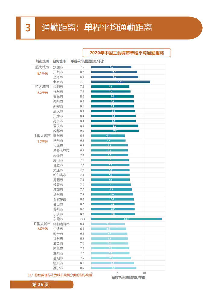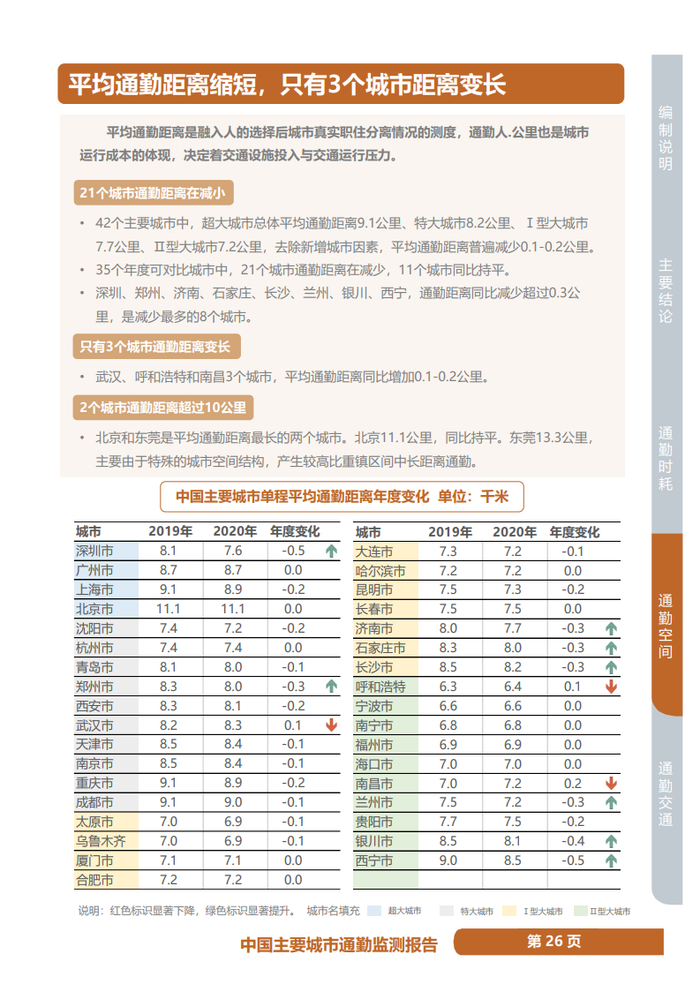 同时21个城市通勤距离缩短,单程平均通勤距离超大城市平均水平为9.1公里,特大城市8.2公里,I、II型大城市分别为7.7公里和7.2公里,同比减少0.1-0.2公里,其中,深圳、西宁、银川、长沙、济南、兰州、石家庄、郑州减少超过0.3公里。