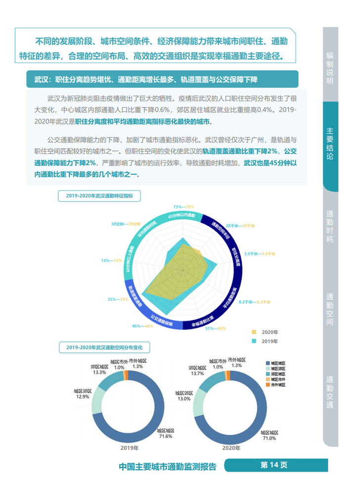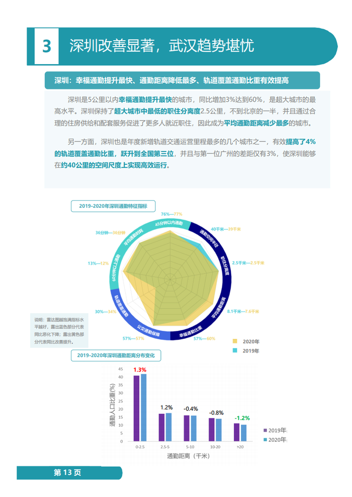 与此同时也注意到,深圳是5公里以内幸福通勤提升最快的城市,保持了超大城市中最低的职住分离度,有效提高了4%的轨道覆盖通勤比重,使其在约40公里的空间尺度上实现高效运行,并成为平均通勤距离减少最多的城市;武汉是职住分离度和平均通勤距离指标恶化最快的城市,职住空间的变化使武汉的轨道覆盖通勤比重下降2%,公交通勤保障能力下降2%,导致通勤时耗增加,武汉也是45分钟以内通勤比重下降最多的几个城市之一。