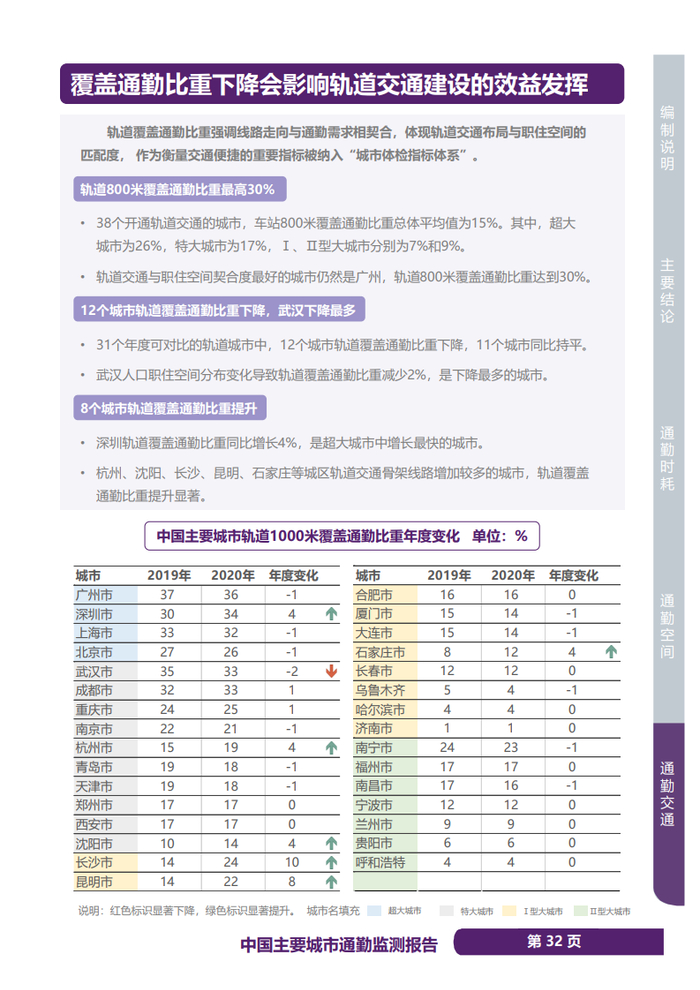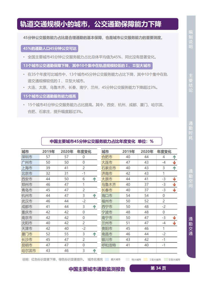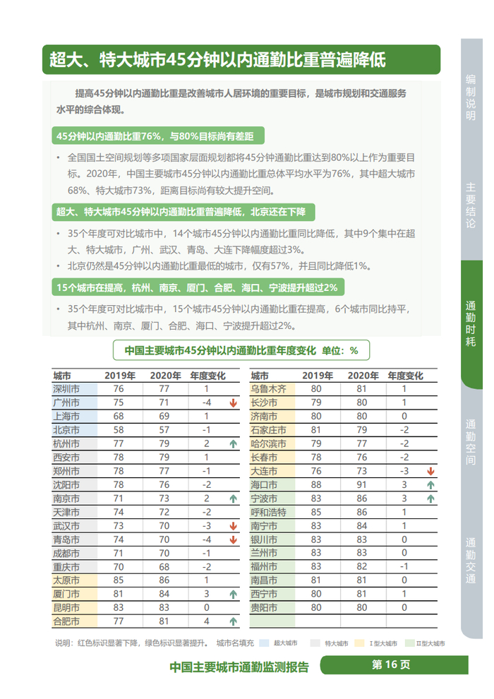《通勤监测报告》显示,2020年,中国主要城市45分钟以内通勤比重总体平均水平为76%,其中超大城市68%、特大城市73%,距离目标尚有较大提升空间。35个年度可对比城市中,14个城市45分钟以内通勤比重同比降低,其中9个集中在超大、特大城市,广州、武汉、青岛、大连下降幅度超过3%。北京仍然是45分钟以内通勤比重最低的城市,仅有57%,并且同比降低1%。