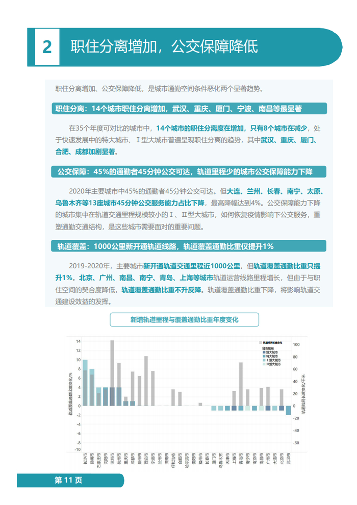赵一新分析称,城市通勤空间条件恶化的两个显著趋势是职住分离增加、公交保障降低:14个城市职住分离增加,武汉、重庆、厦门、宁波、南昌等最显著;45%的通勤者45分钟公交可达,轨道交通里程少的城市公交保障能力下降;2020年全国新开通1000公里轨道交通线路,然而轨道覆盖通勤比重平均仅提升1%,北京、广州、南昌、南宁、青岛、上海等城市这一指标甚至不升反降,虽然有疫情对轨道交通客流的影响,仍需要关注轨道交通的网络客流效益。