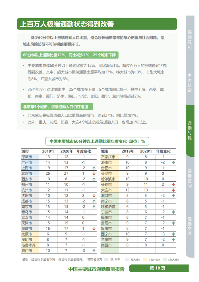 《通勤监测报告》显示,2020年,中国主要城市总体60分钟以上通勤比重为12%,同比降低1%,超过百万人的极端通勤状态得到改善,35个年度可对比城市中25个城市降低、只有5个城市增加,西宁、厦门是改善最显著的城市,但沈阳、长春、北京、重庆、大连极端通勤还在增加。