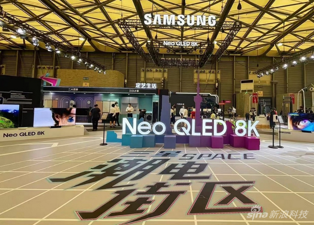 在中心广场和“科技空间”区域,重点展示的是新一代三星Neo QLED系列电视。该系列电视是三星集显示技术与高端设计的大成之作,其使用了全新的量子点矩阵技术,搭载强大的Neo量子点处理器和量子点Mini LED背光,能够呈现出亮暗分明、色彩饱和的HDR画面。