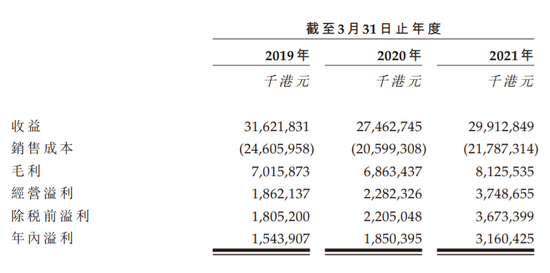 截至2019年、2020年及2021年3月31日止年度,原材料成本分别为135.49亿港元、90.41亿港元及92.44亿港元,分别占公司销售成本总额的55.1%、43.9%及42.4%。