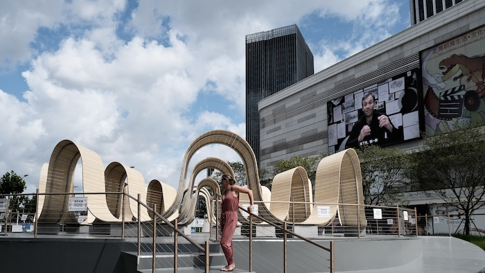走进前滩太古里,首先看到的是一个大型互动装置《请就座》,人们可以在装置任何位置以舒服的方式坐下休息,欣赏周围环境,符合前滩太古里为顾客提供放松、休闲空间的wellness理念。