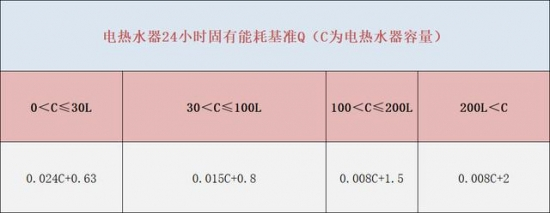 其中,24小时固有能耗系数,直接在我们电热水器上粘贴的,我们可以直接看到。24小时固有能耗基准,这个是国家规范给出的标准,可以直接查询计算方法。如下表: