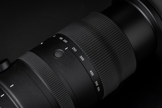 变焦到600mm端,镜筒伸出距离比较长。不过由于宽大的对焦环,整体重心控制非常好。该镜头主体使用铝合金和TSC(耐热复合材料)制成。TSC是一种聚碳酸酯,其热膨胀率与铝相似,确保镜头在不同温度下表现一致。