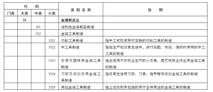 再比如二级分类(大类)中33是金属制品业,其下面的三级分类(种类)332金属工具制造中,3321切削工具制造就已经是该分类目录中第四级的最终分类了。然而,对于业内的从业者来说,这个分类实在是太粗糙了。