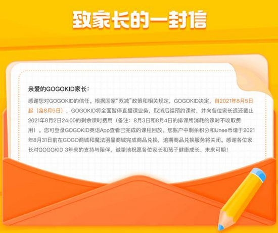 据悉,‘你拍一’和一对一外教 GOGOKID 两款应用目前已经下架。因为《双减》严禁聘请在境外的外籍人员开展培训活动。GOGOKID 官方也证实了这一消息——GOGOKID 发布了《致家长的一封信》,宣布自 8 月 5 日起将全面暂停直播课业务,取消后续预约课时,退还费用。