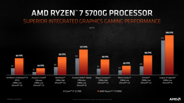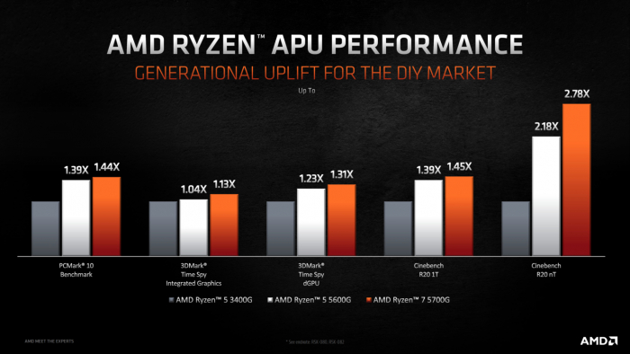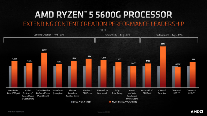 值得一提的是,锐龙 R7-5700G 桌面 APU 的表现,甚至由于英特尔 11 代酷睿 i7-11700 。内容创建速度提升 63%,生产力提升 28%,计算速度提高 60%,图形性能也是后者的 2.45 倍。