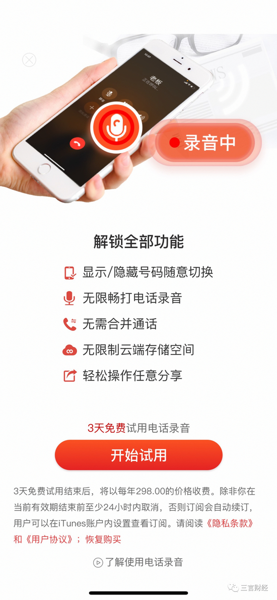 三言财经选择了用充值方式提供通话录音的App体验。充好值后,进入软件内的电话录音入口拨打电话即可。