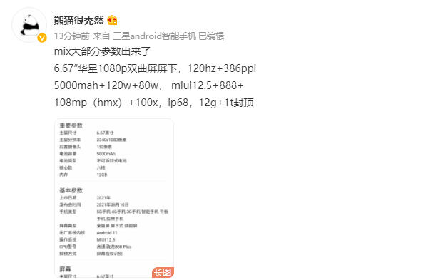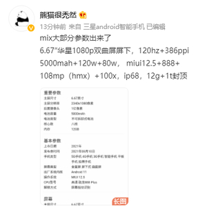 小米MIX 4详细参数曝光:6.67英寸双曲屏、120hz刷新率等
