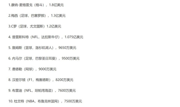 在NBA中,有来自湖人的勒布朗·詹姆斯和篮网球员凯文·杜兰特,分列第五和第十位。此外,瑞士网球天王费德勒排在第七,F1车手汉密尔顿排在第八。