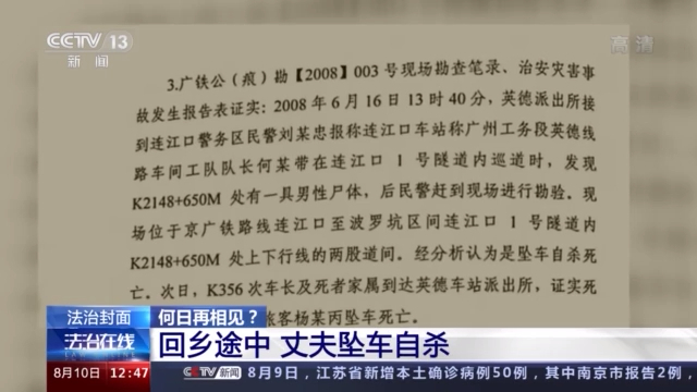 根据铁路公安部门的现场勘查笔录和治安灾害事故发生报告:2008年6月16日13时40分,一位铁路工人在火车隧道内巡查时,发现了夏先菊的丈夫,经分析,认为是坠车自杀身亡。