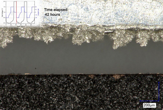 浅灰色晶体结构是在锂电极内部形成的枝晶