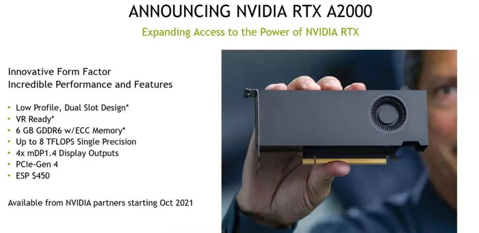 除了变革性的软件,英伟达也在继续拓展专业级显卡产品线,推出了一款面向小型专业工作站的 RTX A2000 显卡。这款新产品的特点是采用了单槽、半高、单涡轮风扇的设计,是迄今为止基于 Ampere GPU 最基础的公版产品,适用于希望获得光线追踪和英伟达人工智能特性的专业人士。