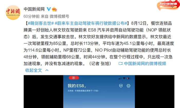 8月14日晚,“美一好”公众号发布讣告称,2021年8月12日下午2时,上善若水投资管理公司创始人、意统天下餐饮管理公司创始人、美一好品牌管理公司创始人林文钦驾驶蔚来ES8汽车并启用自动驾驶功能(NOP领航状态)后,在沈海高速涵江段发生交通事故不幸逝世,终年31岁。