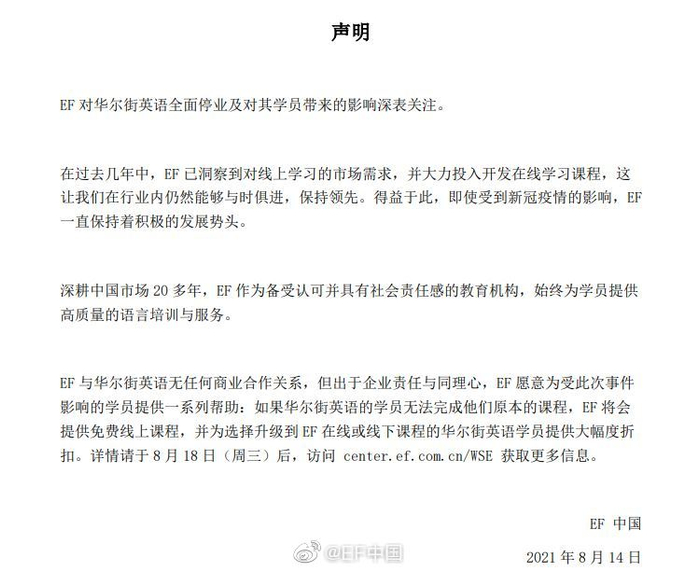 8月14日,英孚教育(EF)在其官方网站和微信公众号发表声明,称将“接纳”华尔街英语无法完成课程的学员。