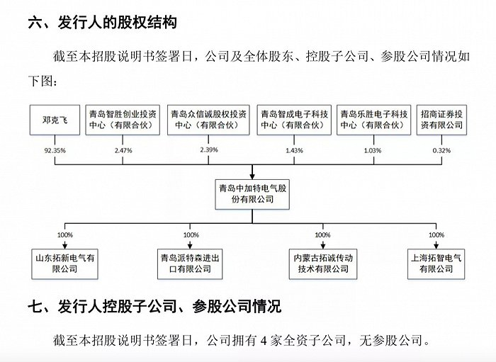 截至招股书上会稿签署日(2020年11月)邓克飞作为实控人,持有中加特92.35%股份;青岛智胜、青岛众信诚、青岛智成、青岛乐胜对中加特的股份占比分别是2.47%、2.39%、1.43%、1.03%;招证投资持股0.32%。