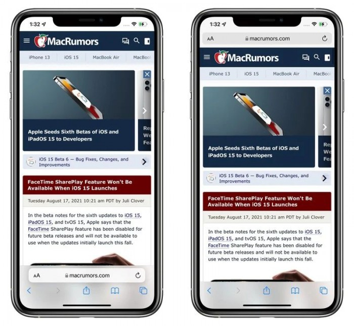 在 iOS 15 Beta 6 中苹果添加了一个切换开关,可以将 Safari 地址栏移动到界面顶部,这使 Safari 恢复到类似 iOS 14 的设计,并减轻了早期 Beta 版中引入的所有 Safari 更改。