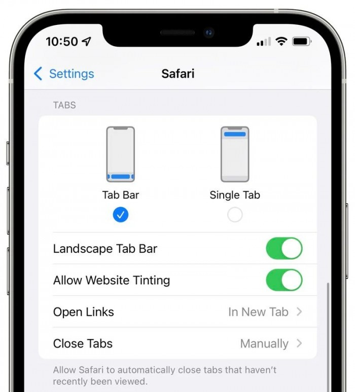 Safari 设计选项可让您在底部的标签栏或顶部的单个标签之间切换,此外还有用于禁用网站着色和启用或禁用横向标签栏的开关。 “允许网站着色”似乎与早期测试版中可用的“在标签栏中显示颜色”设置相同。您可以使用 Safari 中的“Aa”菜单在 Safari 中的两个视图之间切换,而无需访问 Safari 应用程序。