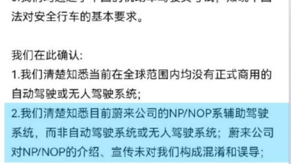 声明以“蔚来车主”的名义,强调“蔚来车主”清楚知悉当前全球范围内没有正式商用的自动驾驶或无人驾驶系统;其次,蔚来汽车的NP/NOP系辅助驾驶系统,而非自动驾驶系统或无人驾驶系统;蔚来公司并未对“车主们”造成混淆和误导;第三,“车主们”表示自己清楚知悉机动车驾驶员安全驾驶的基本要求。