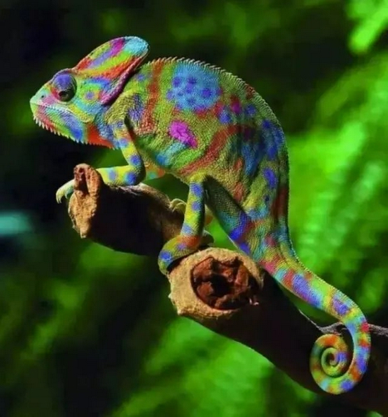 自然界中,生物的颜色可分为化学色和物理色;变色龙发生体色变化时,其实改变的是自身的物理色而非化学色,而最终呈现在我们眼前的体色,则是体表细胞色素呈现的化学色和虹细胞层反射形成的物理色(结构色)交织而成的。小小的变色龙身上,还有很多值得人们去研究的奥秘。