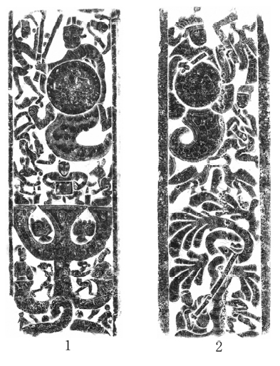 墓葬横长前室的三个立柱上各支持一个底部双弧的纵向过梁(隔梁),中室中部亦有一个底部单弧的过梁。这些过梁上画像风格较为一致,主要为线刻,题材丰富,虽然没有清晰的图像程序,但似乎具有总体的安排,并与墓室结构和前述门楣(横额)上的画像相配合。这里仍然编号论述。
