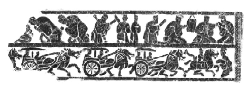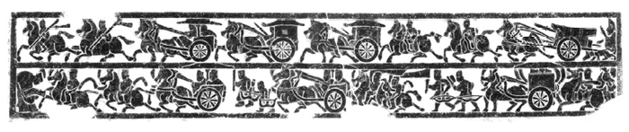 前、中室门楣(横额)上的车马出行画像,总体上由两条各自从前后出发的线性路线对接于一点。