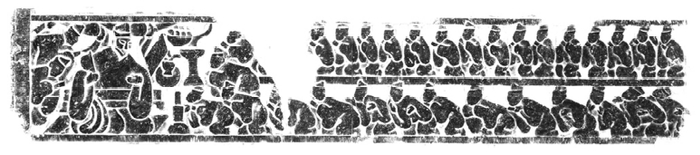 稍可提及的是,山东地区是历史故事类画像最为流行的地区,但主要集中刻画于祠堂之上。墓葬中有些也有集中表现,如沂南汉墓;大多则只是零星的表现,且往往出现在所谓“现实生活”的画像中,如吴白庄汉墓;许多则完全不出现此种题材。也就是说历史故事题材在画像石墓中本来就是可有可无的,集中刻画的情况更在少数,我们推测这些画像恐怕并不像在祠堂上一样,具有多少明确而深刻的内涵,或许只是受到祠堂画像等的影响(毕竟同为墓葬画像石,具有共同的制作群体),反映出的更多是画像石的传统和社会流行的一些普遍观念。而从该过梁画像的整体及与之相连的门楣(横额)画像来看,这里的孝子画像即便有具体的涵义,也应当与祭拜奉敬墓主这一主题有关。