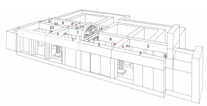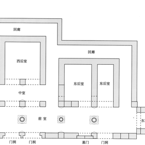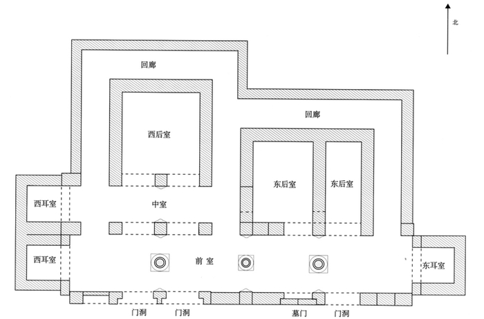 该墓为砖石混筑的大型回廊墓,整体坐北朝南,东西横宽15米,南北纵长9米,高约3.5米。前(南)部为横长前室,其间以东西并排的三个立柱及立柱上的南北向过梁(隔梁)支撑。前室之后(北)整体为回廊包围,分为东西两个部分,东部有紧接前室的后室(东后室),并分为两间,西部前室之后为开放性的中室,其后再为后室(西后室)。整体来看,显然是以西后室为最核心的位置,应为地位最高的墓主的棺室,画像程序和内容也完全符合这一判断(后详)。(图一)
