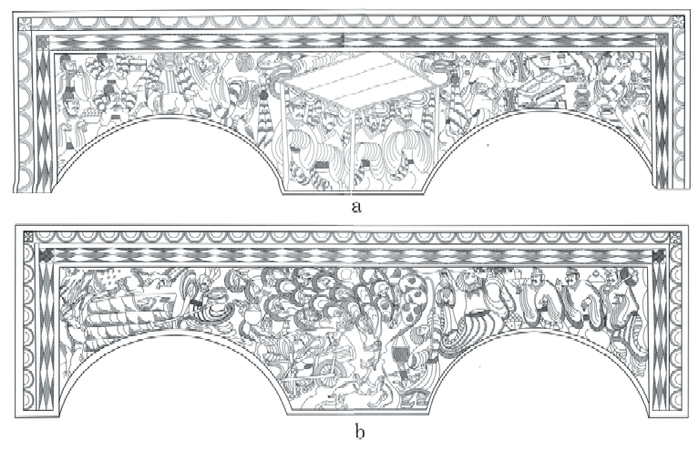 前室东过梁东面(编号a)中部刻画帷帐下端坐四人,左侧(以观者为准,后同)为乐队,右侧为乐舞百戏。(图一六:a)西面(编号b)中部树下有一人坐于车上,左侧一锄田人物回首看向车上人物,报告中正确指出为董永佣耕侍父的表现 ;右侧为数人侍奉一端坐人物。(图一六:b)可见,该过梁画像上总体为宴饮和乐舞百戏,并加入一幅孝子题材。从该过梁的位置来看,其处于前室东部,连接前室前(南)、后(北)壁门楣(横额),而这一部分的门楣(横额)画像上为上述祭拜墓主的车马出行和乐舞百戏、庖厨宴饮等,这里的过梁画像显然与相临的门楣(横额)画像密切相关。而其上的孝子画像也与祭祀墓主这一主题意义上具有一定关联,或许也有一定关系。