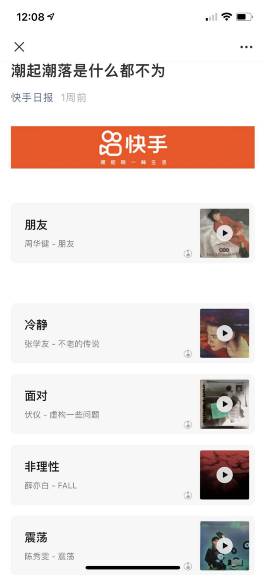而在股价陷入跌跌不休窘境时,8月6日,快手日报在官方微信推送了一条消息,用歌单的方式回应近期股价震荡:《朋友》《冷静》《面对》《非理性》《震荡》《潮起潮落,是什么都不为》《明天会更好》,并以987个“长”字提及长期主义,试图以此提振投资人信心。