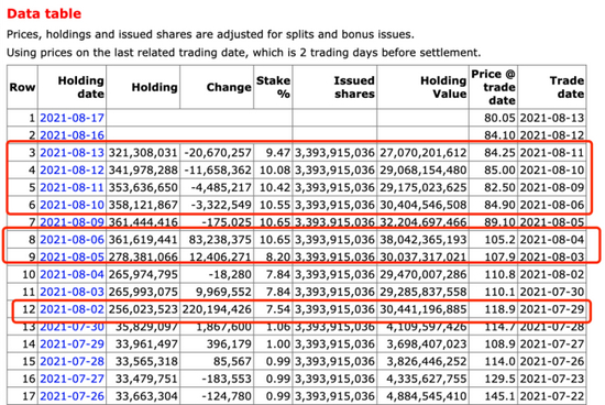 美林证券在7月30日之前持股量在3500万股左右,但是8月1日持股量上升至2.56亿股,8月9日持股量已经达到3.6亿股。8月10日~8月13日,显示有机构通过二级市场或大宗交易方式陆续减持达到4554万股,减持价格在每股82港元~89港元,套现合计达到34亿港元。