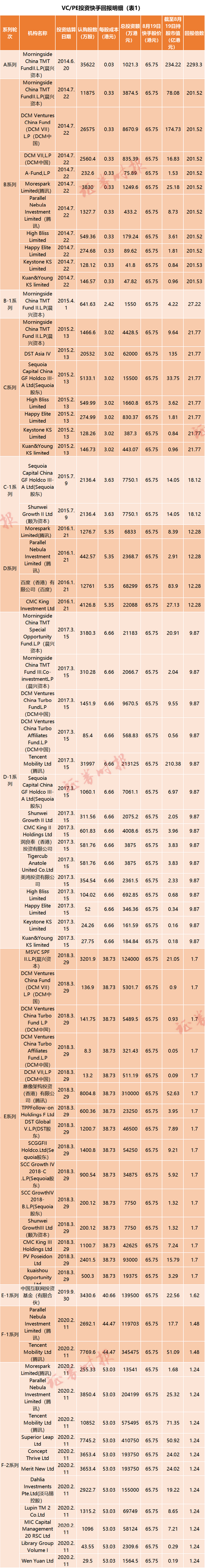 参与B轮的投资机构,投资回报倍数为202倍,B-1轮的投资回报倍数约27倍,投资收益累计达到314亿港元。C轮的投资机构整体回报在18倍~22倍之间,投资收益累计204亿港元。D轮的投资机构整体回报倍数在9~13倍之间,E轮投资人则在1.7倍左右,F轮回报最少,1.2~1.5倍左右,但考虑到F轮投资机构的时间成本只有1年,因此,该投资回报率亦可观(表1)。