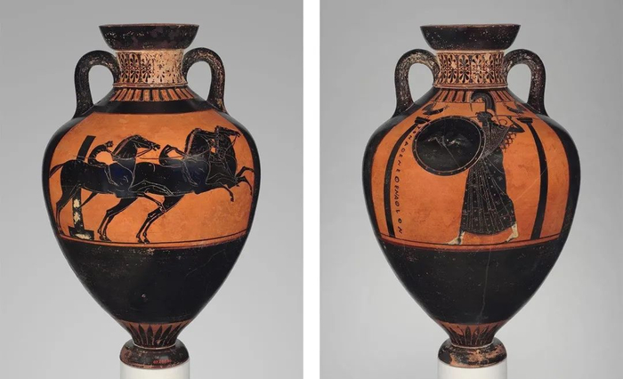 陶制帕雅典娜双耳罐(局部),约公元前530年。希腊,阿提卡。传由画家尤菲利托制作。赤陶土,24½英寸(62.2厘米)。纽约大都会艺术博物馆,罗杰斯基金捐资购藏,1914年