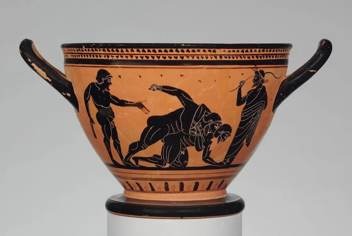 古希腊竞技有一种野蛮的、全身接触的格斗运动,可以称为综合格斗 (pankration),是摔跤、拳击和踢打的结合体。这种比赛几乎没有任何规则,只有啃咬和挖眼睛是明令禁止的。这个赤陶双耳大饮杯绘制的是教练正密切注视一场生死攸关的比赛的场景。一些格斗选手拥有标志其格斗技能的绰号。索斯特拉托斯 (Sostratos) 是来自西库昂 (Sikyon) 的一名斗士,他的惯用技能就是在比赛一开始折断对手的手指,因此被称为“指尖”。难怪希腊人能成为运动医学专家!