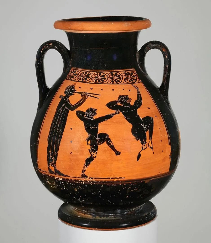 古希腊人认为音乐可以提高肢体的协调和动作,无论是用于跳舞或军事演习,甚至体力劳动。所以除了私人教练,专业音乐家也在体育竞赛中有着重要作用。皮莱克罐上的这个人物演奏的是一种叫做轴管 (aulos) 的双管乐器,两位拳击手随着他演奏的音乐轻快地踱步,边走边练拳。