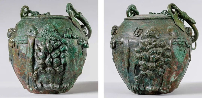 饰有狮皮和神首柱的青铜香脂瓶,公元1世纪末至2世纪初,罗马帝国中期,青铜,3 英寸(7.6 厘米), 纽约大都会艺术博物馆藏,约翰·J.梅德维基斯 (John J. Medveckis) 向艾米丽·拉弗蒂 (Emily Rafferty) 致敬并庆祝博物馆成立 150 周年礼赠,2021年