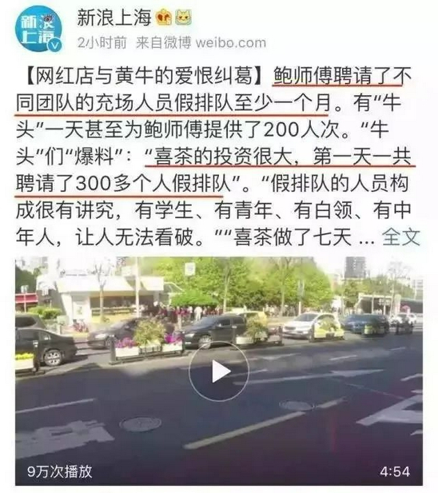 同年6月,有媒体报道称,网红店排队的人群中有职业黄牛。“喜茶的投资很大,第一天一共聘请了300多个人假排队。黄牛们每天都会在朋友圈里招人排队,排队一趟报酬30块。甚至有些阿姨,给15块、20块就愿意来排。”