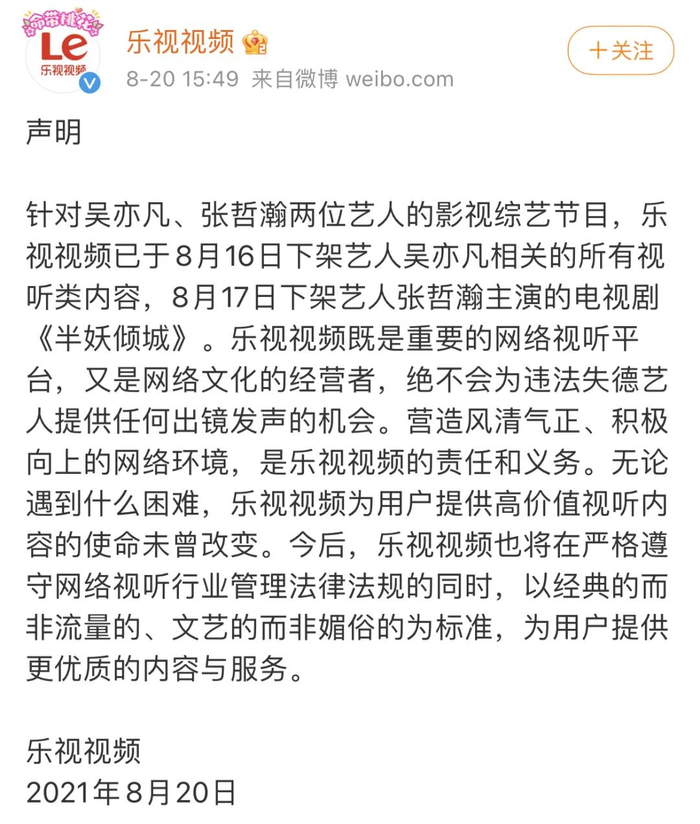 此后张哲瀚的所有主要参与的作品开始全面下架处理。影视综艺方面,@乐视视频 宣布已于8月17日下架张哲瀚主演的电视剧《半妖倾城》。