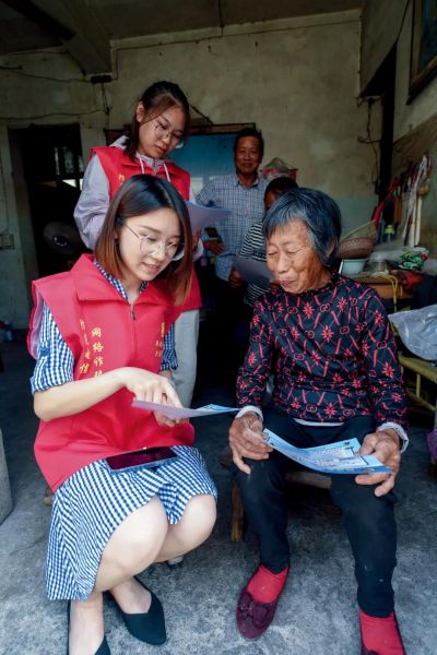 5月10日,浙江杭州市临安区龙岗镇汤家湾村,反诈志愿者服务队成员入户给村民宣讲如何防范新型电信诈骗。图/新华