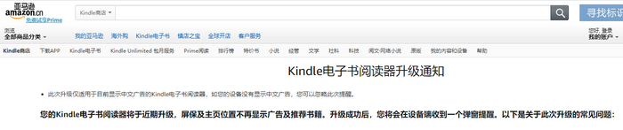 亚马逊官方指出,此次升级仅适用于目前显示中文广告的 Kindle 电子书阅读器。这些广告是指用户的 Kindle 电子书阅读器开机屏保及主页上显示的第三方广告及电子书促销信息。