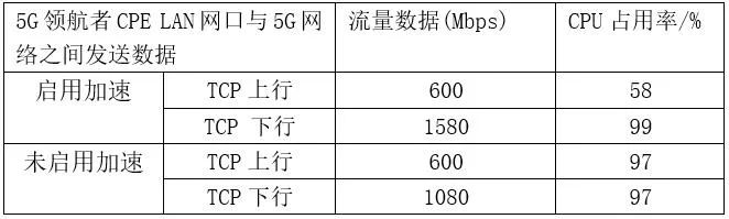 使用5G CPE在5G NSA网络下使用TCP报文进行测试,在5G CPE传输数据未消耗完CPU资源的场景下,采用包加速技术可以降低CPU损耗。5G CPE传输数据流量超过CPU负载能力时,采用包加速可以提升5G CPE传输性能。具体测试结果如表2所示,本文所采用的5G CPE TCP未优化前可以达到上行600 Mbps下行1 080 Mbps,采用加速技术后,下行提升到1 580 Mbps,上行由于网络限制,跑满600 Mbps时CPU占用率比未加速时降低39%。