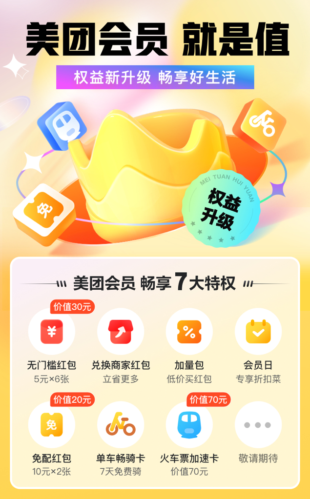 日前,美团会员权益正式升级,在原有的美食红包之外,会员还可享受免配红包、会员日专属折扣菜、单车畅骑卡、火车票加速卡等多项权益。