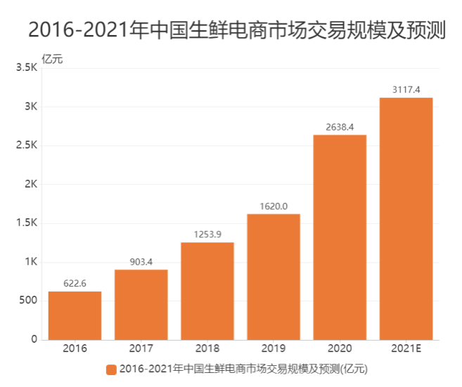 相关数据显示,自2016年起,中国生鲜电商市场规模不断扩大,2019年市场开始迎来高速发展,2020年我国生鲜电商市场规模已达2638.4亿元,预计2021年市场规模将达3117.4亿元。