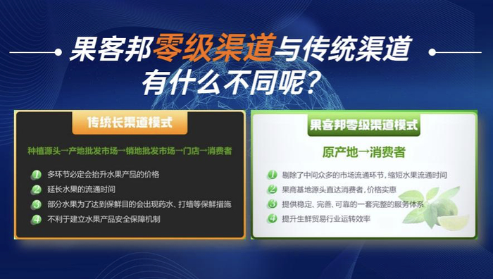 “从源头助力重构果品供应链”,这既是果客邦平台的slogan,也是对供应链体系的形象诠释。剔除中间众多的市场流通环节,实现应季时令水果直接从果园采摘运输到客户手上;通过链接优质源头水果生产者与采购经营商及广大消费者,为平台用户提供极致的果品电商服务体验,让用户体验优质、健康、美味的水果甜蜜之旅,可以足不出户尊享“优鲜生活”。