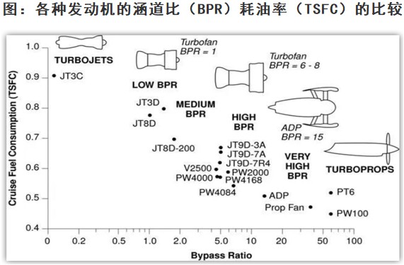 衡量涡扇航空发动机有几个指标,涵道比(BPR)、推力、耗油率(TSFC)等。涵道比,即外涵道进气量与内涵道进气量之比。民航客机一般使用大涵道比涡扇发动机,涵道比可达10甚至15,非常省油,但是体积会比较大,推力也大。战斗机一般使用小涵道比涡扇发动机,通过喷射燃烧产物获得推力,机动性强,但是耗油严重。从下图看到BPR越高的,比如Turbofan(涡扇)的TSFC就越低,就更省油。Turbofan比Turbojet(涡喷)BPR更高,耗油率更低。Turboprops(涡桨)的油耗最低。