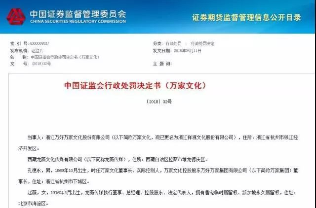 2018年,赵薇和丈夫黄有龙因收购万家文化信披违法违规被证监会顶格处罚。证监会对赵薇、黄有龙给予警告,并分别处以30万元罚款,同时对二人分别采取5年证券市场禁入措施。