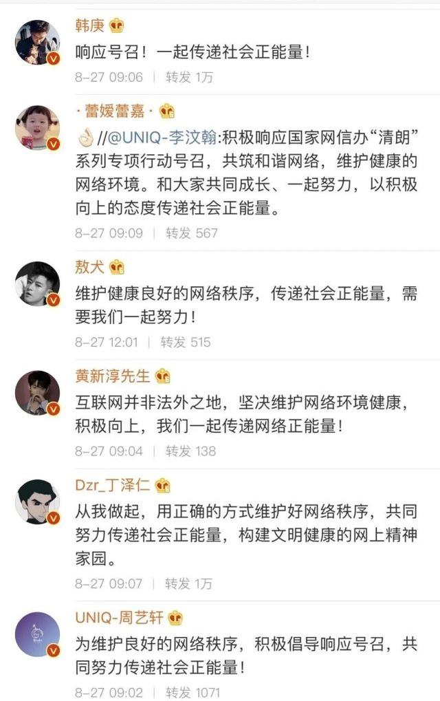 通知发布后,众明星纷纷表态: